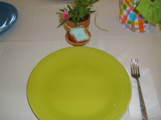 The boys worked on these place settings all week. We bought little pink flowers and put them in miniature pots. They watered them and placed them in the sun each day to keep them alive.